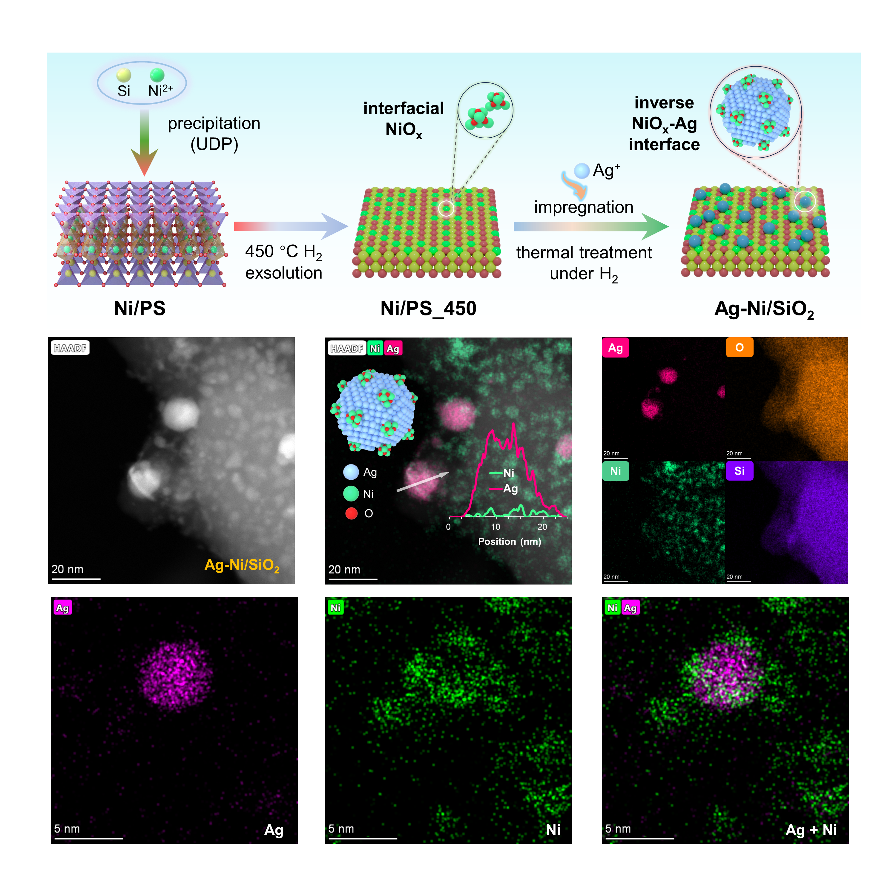 近日,课题组在酯加氢反应的界面催化反向设计方面取得新进展,通过“反向NiOx–Ag界面构筑”策略,实现了酯分子与氢分子活化的空间解耦,解决了酯加氢反应中活性与选择性之间的相互制约难题。相关研究成果以“Inverse NiOx-Ag Interface to Decouple Reactant Activation for Ag–Ni/SiO2-Catalyzed Ester Hydrogenation”为题在Angewandte Chemie International Edition上在线发表。