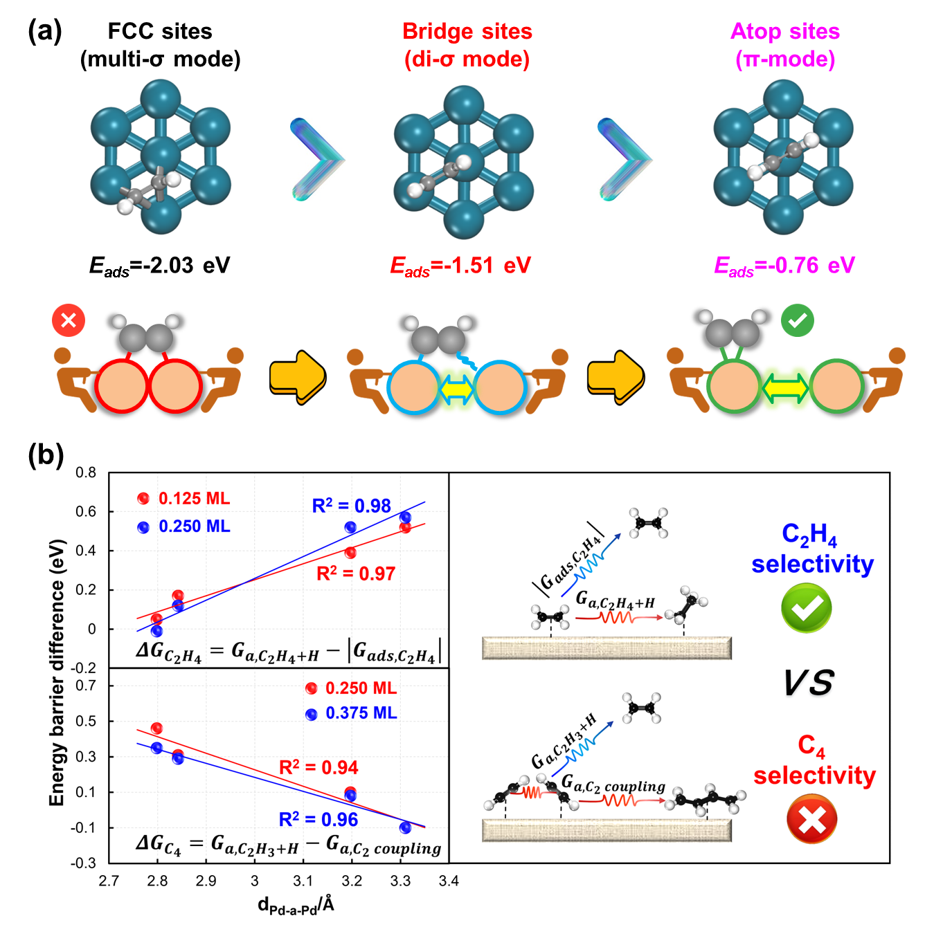多相催化对于化学工业意义重大,广泛应用于能源转化、精细化工、环境保护等领域,其核心目标是在高效转化反应物的同时,最大限度提高目标产物选择性、减少副产物生成。高选择性催化技术能显著降低能耗、减少废弃物排放,不仅直接关系到生产效率与成本控制,更是实现绿色可持续化工过程的关键。然而,由于催化反应中存在多条竞争反应路径,如何精准调控催化选择性实现定向转化长期以来是催化领域的难题与挑战。研究团队经过多年系统研究发现,反应物在催化剂表面的吸附构型是决定反应路径的核心。基于此,团队创新性地提出“吸附构型匹配”设计理念:通过精准调控催化剂活性位点的结构与电子特性,使其与底物分子的结构特征形成定向适配,从而优先稳定目标反应所需的吸附模式,同时抑制竞争性吸附与副反应路径。