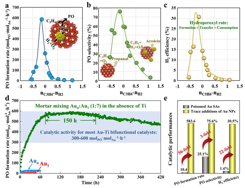 进一步通过调控Au SACs和Au NPs的空间距离与床层分布,实现了反应物覆盖度的匹配,从而实现了过氧化氢自由基的形成、转移和消耗的速率匹配。实验证明,仅需添加占Au SACs质量0.3%的微量Au NPs解毒剂,即可显著提升环氧丙烷的生成速率(56倍)、选择性(3倍)和H2效率(22倍),并且这种优异性能能够持续稳定150小时以上。这一发现不仅为催化领域的研究和应用带来了新的突破,也为可持续化学工业的发展贡献了重要的思路和实践经验。