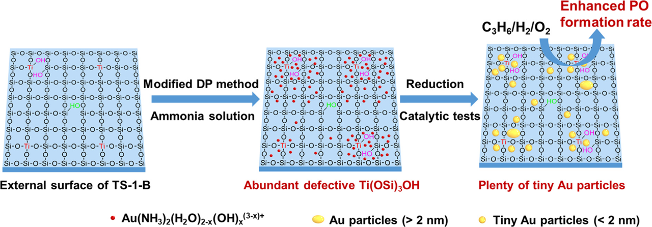 近日,华东理工大学催化反应工程团队在高效金-钛双功能催化剂制备方面取得重要进展。他们创新性地采用氨水作为沉淀剂,通过改进的沉积-沉淀(DP)法,成功在未煅烧钛硅分子筛TS-1-B上同时实现了小尺寸金颗粒(约1.6 nm)的均匀负载与缺陷Ti物种(Ti(OSi)₃OH)数量的显著增加。该方法制备的催化剂在丙烯与氢气、氧气直接环氧化合成环氧丙烷(HOPO)反应中,展现出极高的活性、选择性与氢气利用效率,性能显著优于传统的DP尿素法及其他已报道的催化剂。